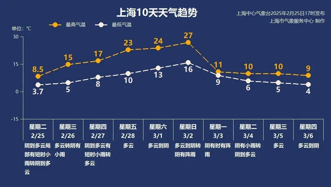 受西南暖湿气流影响,27日晚至3月1日上午,崇明、浦东、金山、奉贤等地及沿海地区可见度将低于500米雾天气,可见度将低于200米。月底3月初,当地气温先升后降。2日前气温明显升高,最高可达27℃左右,3日迅速降至11℃左右,伴有强风降雨。
