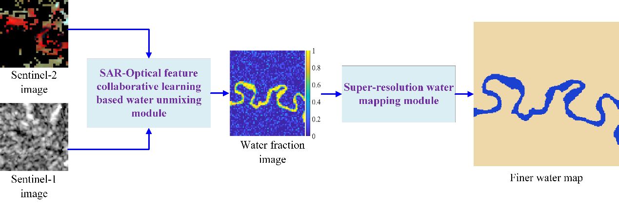 光学-SAR协同学习超分辨率水质提取示意图