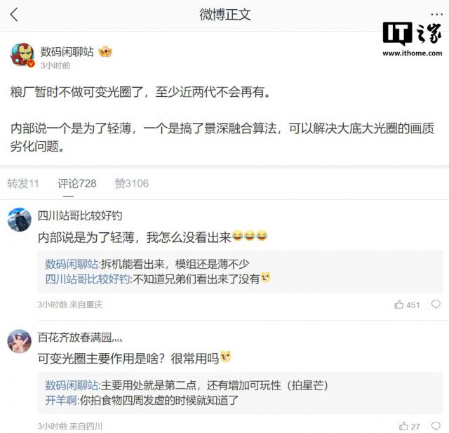 IT 世家 2 月 25 日消息,小米曾经在小米。 13 Ultra、小米 14 Ultra 根据博主的说法,旗舰机配备了可变光圈技术, @数码闲聊站 今日消息,小米暂时不做可变光圈,至少最近两代不会再有可变光圈了。。