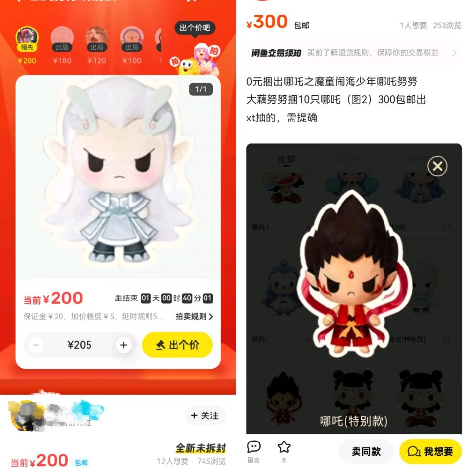 而且从品类上看,呼吁已久的毛绒产品出现了严重的缺货问题,不仅收不到,还买不到。万代南梦宫旗下的毛绒产品以不定期掉落预购的方式销售。闲鱼上,哪吒普奇努努,一个聪明的少年,原价29.9元,被炒到300元,隐藏的敖光直接被“拍卖”。