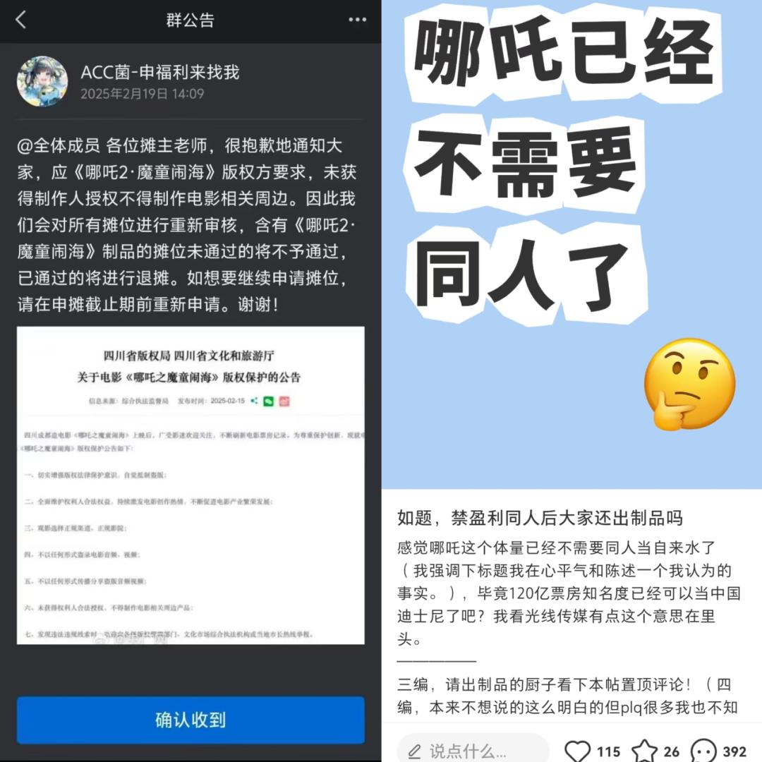 但是最近,《哪吒2》生态圈也掀起了一场“同人产品”地震。一周前,四川省文化和旅游厅发布公告,呼吁保护《哪吒魔童闹海》的版权。第六条明确表示“未经权利人合法授权,不得制作与电影相关的衍生品”。;此后,ACC等展览明确表示“不接受哪吒关于粉丝产品的摊位”,部分粉丝产品厂也停止接受哪吒2相关产品的订单。有一段时间,关于“哪吒2不需要粉丝”的声音沸沸扬扬。