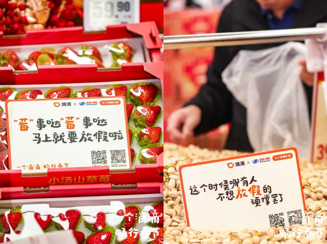 2024年春节期间,大大小小的儿童俱乐部和滴滴出行以“非常新的假期通知”为主题,将超市变成了年轻人的情感释放场:海鲜区“假期不钓鱼,给父母一只手”直接击中了工人的烦恼,干货区的“硬支撑”直白而富有共鸣感,成为拍照打卡墙,相关话题在微博热搜中占据榜首。