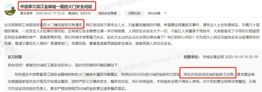 位于武汉的中信泰富滨江金融城,在此之前,还有质量问题、安全隐患、虚假广告等。