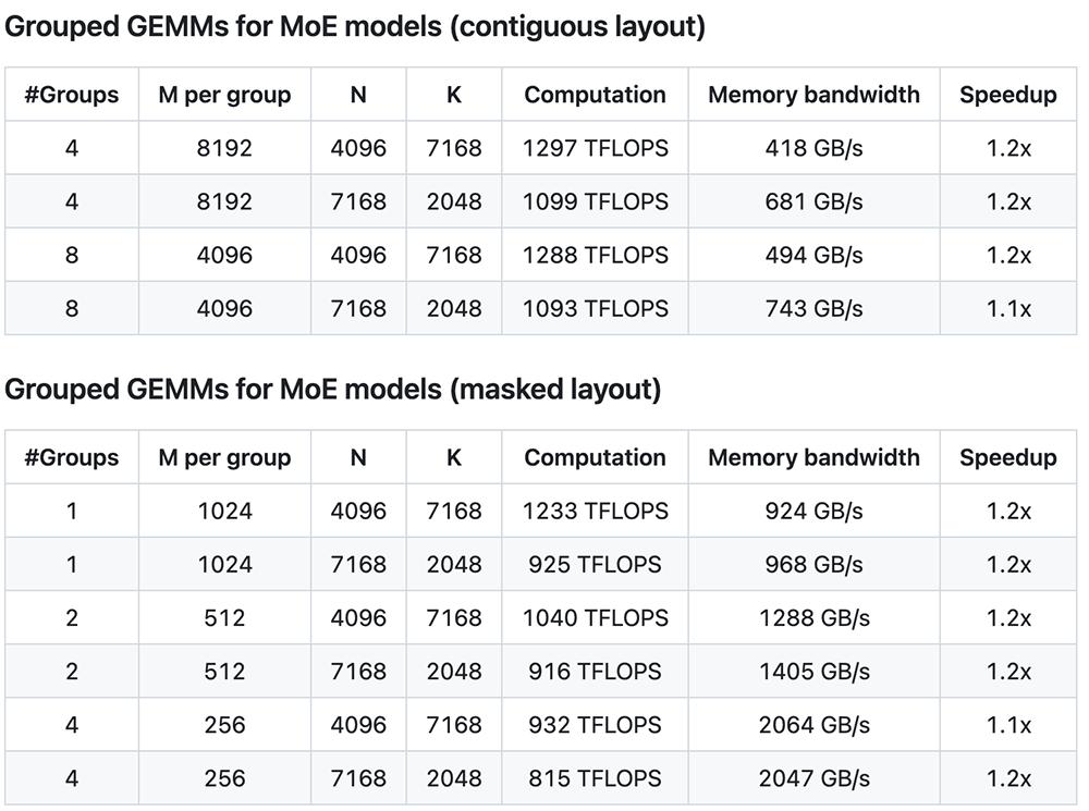 根据DeepSeek曝光的数据,一般GEMM(密集模型)中矩阵运算可以加速高达2.7倍,在GEMM(MoE模型)中分组连续布局,在掩码布局下可以加速高达1.2倍。