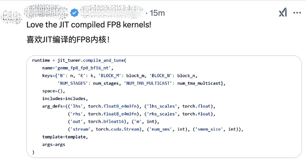 选择完全即时编译的DeepGEMM。(JIT)在安装过程中,设计不需要编译。所有的核心都是在运行过程中使用轻量级JIT进行编译。该方法具有以下优点: