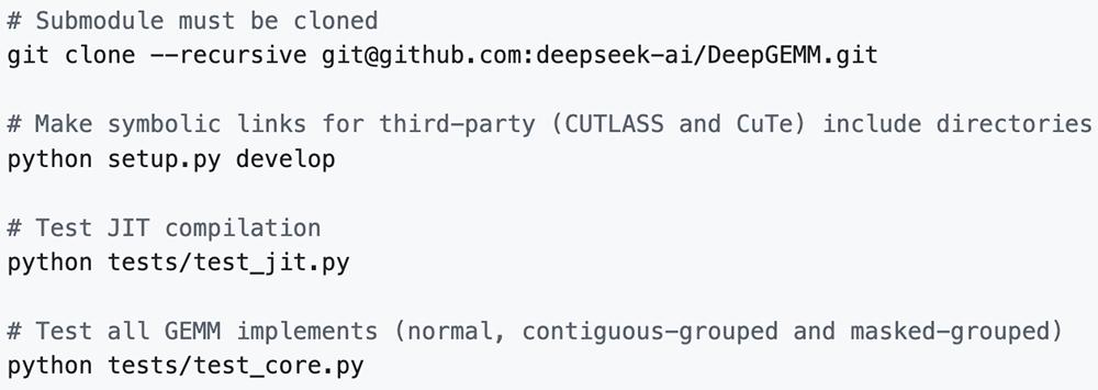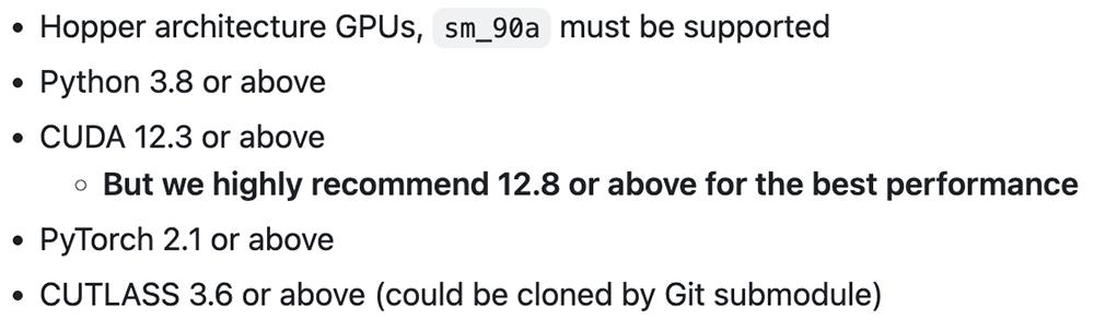 DeepSeek分享了一个清晰的上手指南,需要HopperGPU架构。、必须支持sm_90a,要求是Python 3.8、CUDA 12.3、PyTorch 2.1、CUTLASS 或者更新版本3.6。DeepSeek强烈推荐CUDA 为了获得最佳性能,12.8或更高版本。