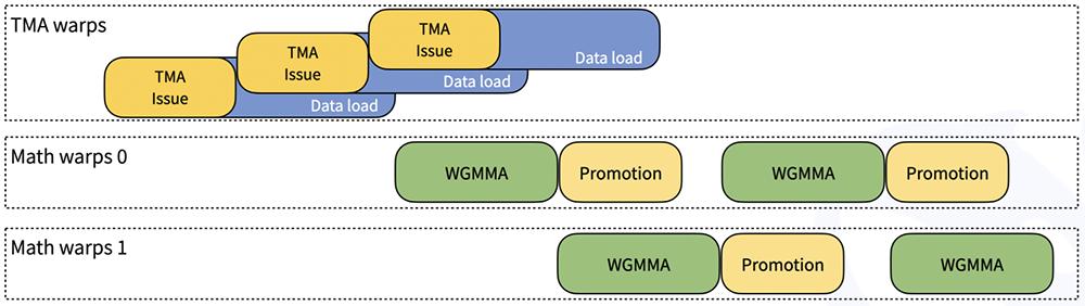 使用DeepSeek?表示排除在CUTLASS之外的技术。根据CUTLASS的设计,DeepGEMM中的核心经历了warp的特殊化,可以实现重叠数据移动、张量核心MMA指令和CUDA核心提升。下面的图表显示了这个过程的简化图表: