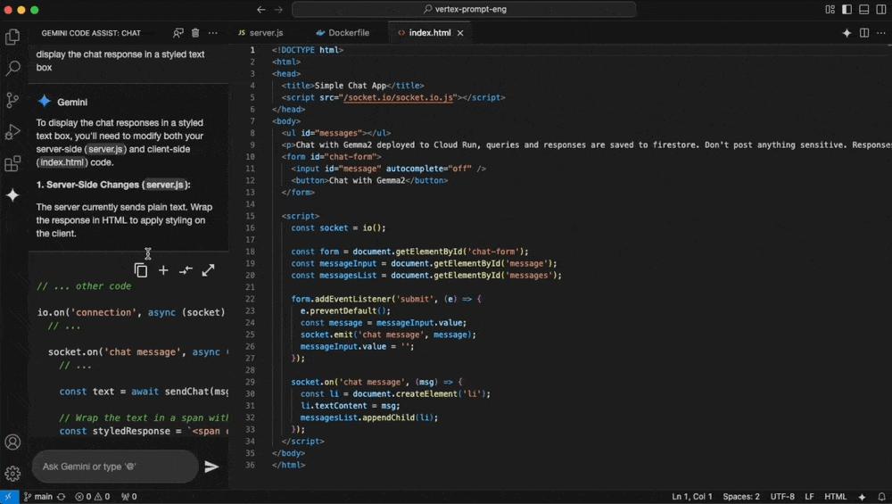 下面的图片是Gemini Code 根据自然语言提醒,Assist建立代码并将变更应用于当前代码的例子: