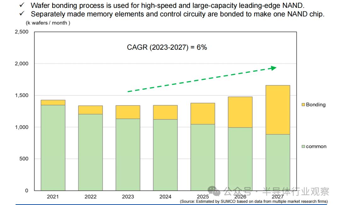 在未来几年内,晶圆键合技术在NAND的生产中也将变得越来越重要,特别是在满足高性能、大容量存储的需要时。通过连接分别制造的内存元素和控制电路,可以形成一个完整的NAND芯片,从而降低连接长度,提高速度。采用两个晶圆(内存和逻辑)结构,在这个过程中将成为主流技术。预计2023-2027年间,晶圆键合需求将保持增长,年均复合增长率将保持增长(CAGR)为6%。