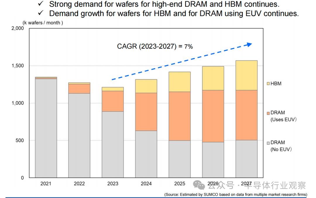 在DRAM领域,随着AI芯片需求的快速增长,HBM将在控制逻辑上方堆叠8至12层DRAM芯片,可以实现更小的芯片面积、更多的存储容量和更高的响应速度。据SUMCO统计,预计2023-2027年对高档DRAM和HBM晶圆的需求将持续增长,年均复合增长率(CAGR)为7%。与没有EUV技术的DRAM相比,使用EUV的DRAM晶圆需求更高。