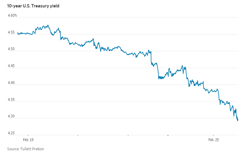 从“美国新政府尚未实现我们对经济增长的预期”到“美国政策可能开始对经济造成真正的损害”,周一的论调发生了变化...这就是为什么美国10年期国债收益率在两个多月来达到最低水平,未来几周可能会再次下降。