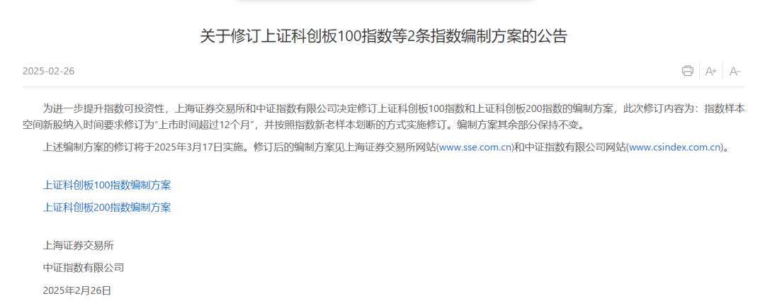 2月26日,上海证券交易所和中国证券指数有限公司联合发布公告称,拟修订上海证券科技创新板100指数和上海证券科技创新板200指数的编制方案,将新股纳入时间要求修订为“上市日期超过12个月”,并按照划断指数新旧样本的方式进行修订。上述编制方案的修订将于3月17日实施。