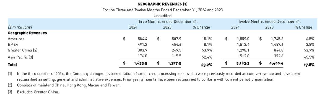从区域市场来看,大中华区已经成为2024年亚玛芬增长最明显的区域。2024年,大中华区收入12.98亿美元,同比增长53.7%;同比增长45.5%的亚太地区5.13亿美元;18.59亿美元在美洲;15.13亿美元在欧洲、中东和非洲。