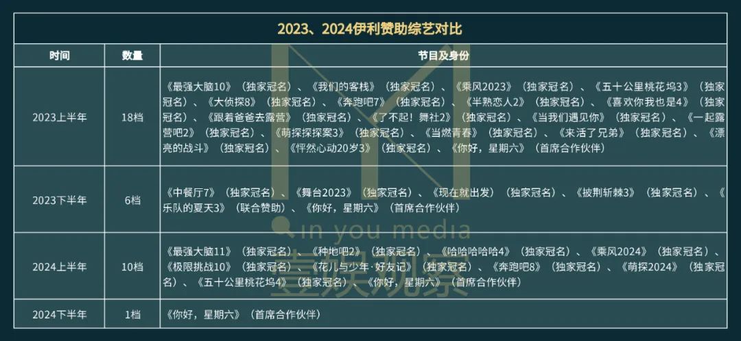 造成这种变化的一个原因是大金主伊利前几年在综艺节目上的速度放缓了。一个娱乐观察(yiyuguancha) 总结了2024年综艺赞助的情况,伊利及其产品赞助了10个上下节目,大部分都是独家命名的合作模式。然而,2023年,据不完全统计,伊利赞助了23个长视频综艺节目。相比之下,伊利对长综艺节目的投入大幅减少。
