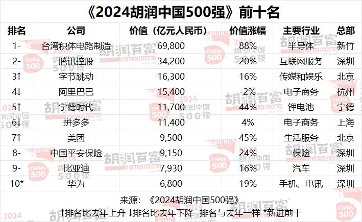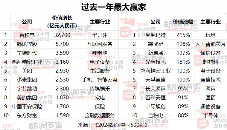 根据榜单数据显示,胡润中国500强企业总价值上涨6.6万亿元(13%),总计达到56万亿元。在前排,台积电价值上涨3.27万亿元,以6.98万亿元再次蝉联中国价值最高的民营企业。