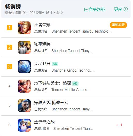 在移动端游戏市场当中,腾讯的产品一直以来都是头部位置的有力竞争者,我们能看到在其内部“长青化”战略下诞生的《王者荣耀》,是登顶畅销总榜的常客。而像《CFM》《和平精英》等老产品也都能够持续焕发生机,紧随《王者荣耀》之后。
