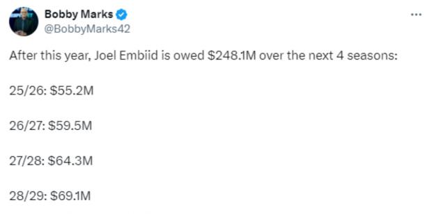 另外,恩比德的合同一直持续到现在。 2029 2008年,最后一年的工资高达 6907 万,这意味着球队至少要承受恩比德四年的压力。对了,保罗 - 乔治也签了合同 2028 2008年,乔治每年都能带领球队。 5659 万。也就是说,在不久的将来,球队只支付这两个人的工资将超过每年的工资。 1.2 亿。