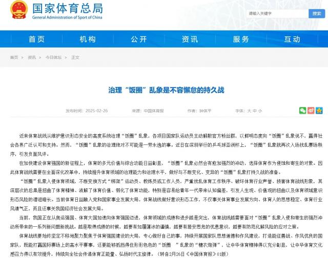在加快建设体育强国的新征程上,体育的多元化价值和综合功能日益突出,“粉圈”乱象肯定会有更强烈的冲动,选择体育作为腐蚀和寄生的对象。因此,在全面深化改革的过程中,体育一线需要不断提高体育领域的治理能力和水平,为不断变化变异的“粉圈”乱象做好持久战的准备。