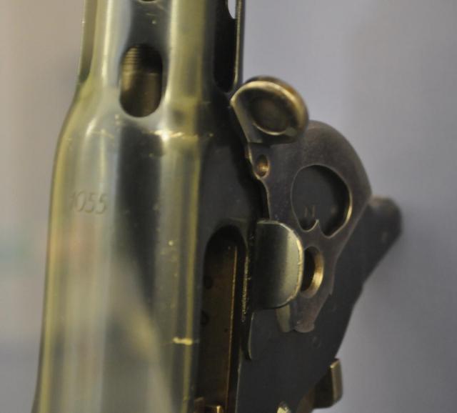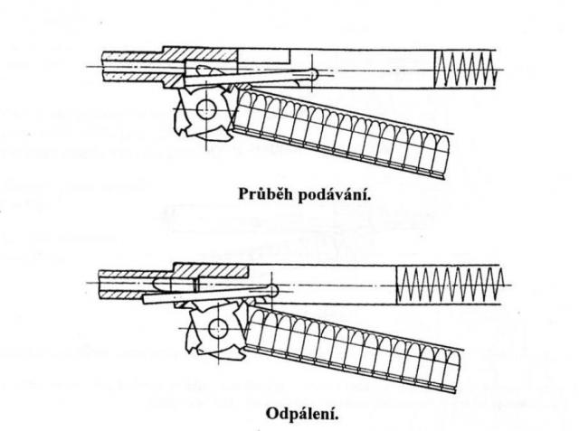 为了解决这个问题,供弹机制增加了一个棘轮设备——当枪机旋转时,一根长杆将其推动,直到枪机与弹膛之间的距离适中。这种棘轮设备将旋转并推动供弹器,供弹器的齿轮将子弹推入弹膛。