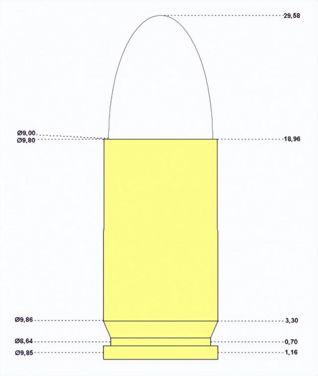 "霍莱克"(Hol ě k)提出的解决方案几乎是直接的——他设计了一个 9x19 基本没有锥度子弹的规格(9 mm v á lcov ý「圆柱型」),在弹头到弹壳凹槽的长度上,这种子弹的规格只差 0.06 mm。