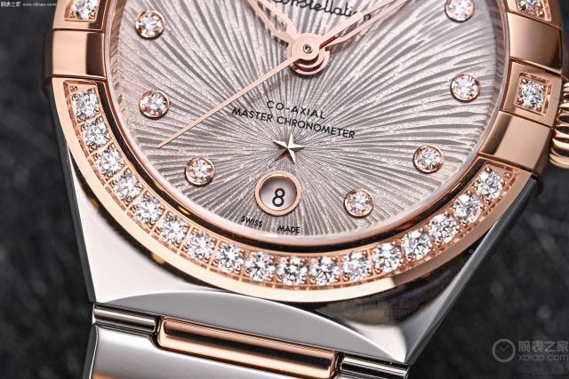 这款 29 毫无疑问,mm表款是星座系列中为女性精心雕琢的璀璨明珠。表壳采用精刚和 Sedna 18K 金色的完美结合,精巧坚韧耐用,赋予手表可靠的品质,Sedna 18K 金则增添了奢华高贵的质感,两者相辅相成,完美契合现代女性刚柔相济的气质。精心铺设在表圈上的钻石,每一颗都经过严格的挑选和精心的嵌入。在光线的照射下,它们就像一串闪闪发光的星星围绕着表盘,展现着女性的优雅和高贵,手势间散发着迷人的光芒。