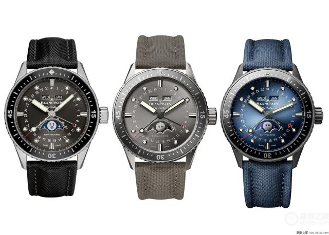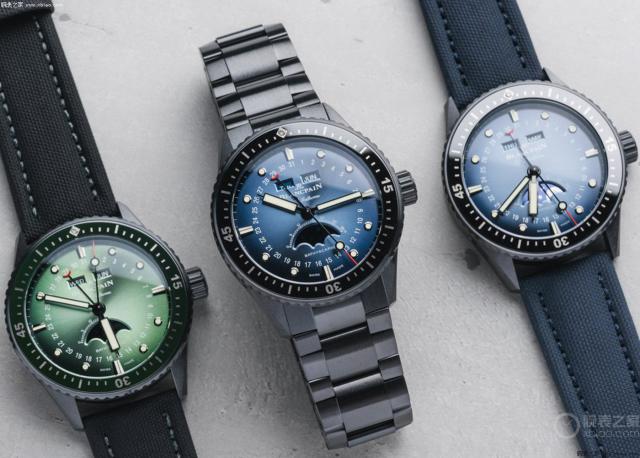 宝珀 50 全历月相、瓷壳、冰蓝盘、极光绿等深潜器,配有不同的表带。