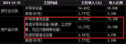盛美上海半导体清洗设备产品作为国内半导体清洗设备的龙头,2024年贡献的营业收入占总收入的72%左右,达到40.57亿元;其它半导体设备的收入占20%左右,而先进封装湿法设备的收入占比不到5%。