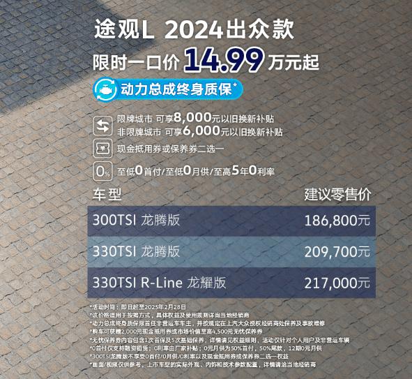 日前,2024 款大众途观 L 优秀款限时一口价 14.99 一万元起,顾客买车还可以享受以旧换新补贴、动力总成终身保修等权益,政策有效期到期。 2025 年 2 月 28 日本。值得注意的是,这一限时价格适用于抵押方式。