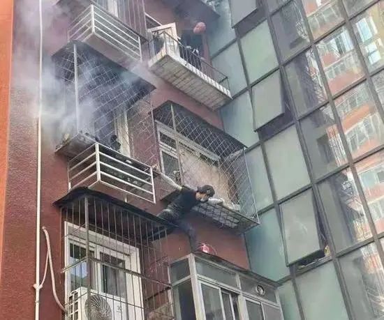 2021年4月27日下午,在北京市某小区,一栋住宅楼三层阳台防盗窗里的杂物突然起火,小区里送来的快递员带着灭火器爬出三层阳台,扑灭了火势。