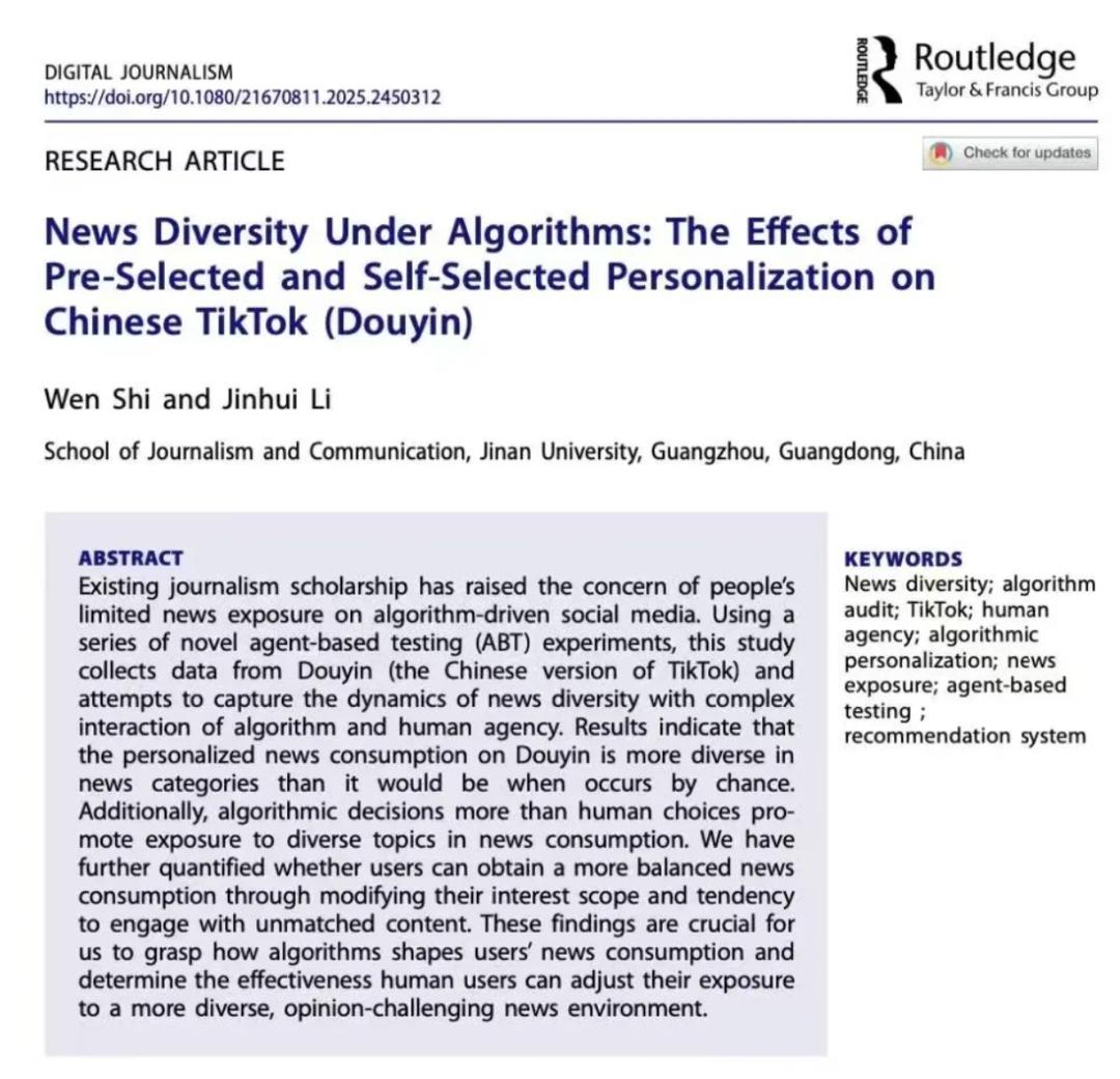 最近,顶级传播学期刊《Digital Journalism》暨南大学新闻与传播学院发表论文《The Effects of Pre-Selected and Self-Selected Personalization on Chinese TikTok (Douyin)》,研究小组通过虚拟代理进行检测(Agent-Based Testing, ABT)在抖音上模拟用户的三种内容消费模式:1. 纯粹的随机推荐:没有算法干涉,内容完全随机;2. 个性化算法预选:推荐内容仅由算法决定;3. 预选 选择结合:算法建议叠加用户主动互动(如点赞、评论)。