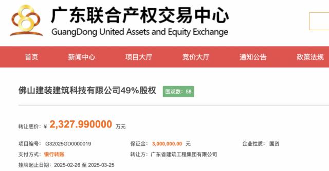 广东建筑工程挂牌转让佛山建筑49%股份,转让底价2328万元