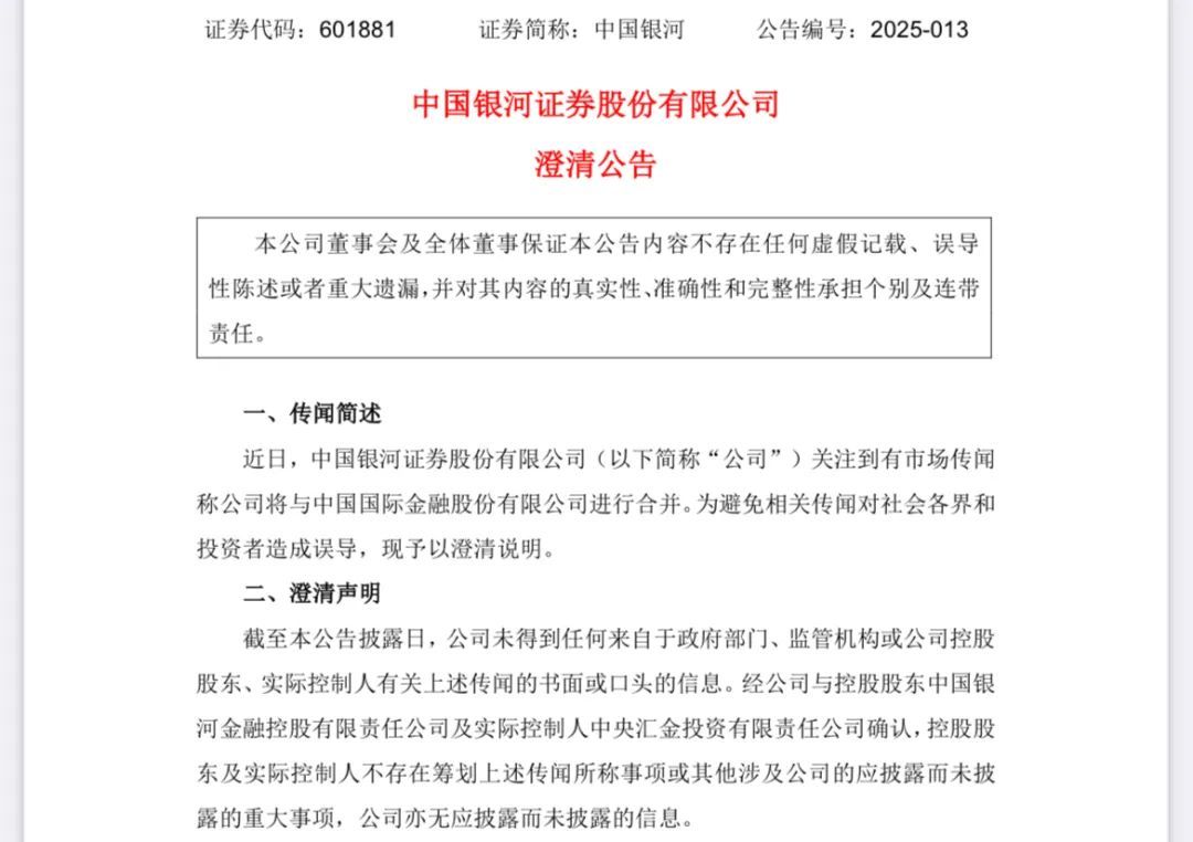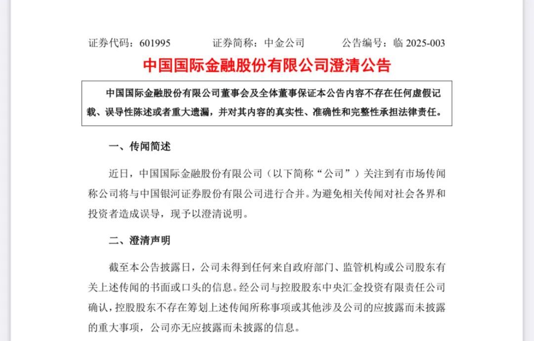2月26日,CICC公司发布公告,注意到市场传言称,该公司将与中国银河证券有限公司合并,现作出澄清说明。截至本公告披露日,该公司未获得上述政府机构、监管部门或股东的书面或口头信息。控股股东不会准备上述谣言或涉及公司的其他重要事项,但不会披露。
