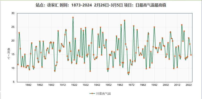 温度冲击记录:徐家汇站至今已有正式气象记录,2月26日至3月5日期间,1921年2月27日出现了最温暖的一天,最高气温达到28.5℃,其次是1966年3月2日的27.4℃,今年3月2日的最高气温将对这一记录产生强烈的影响!
