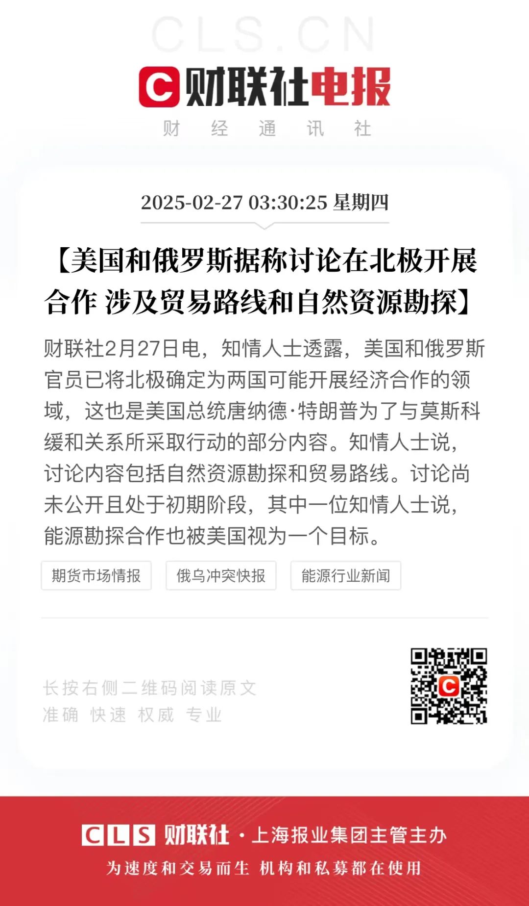 据报道,美国和俄罗斯在北极进行了合作,涉及贸易路线和生态资源勘探