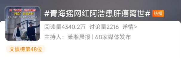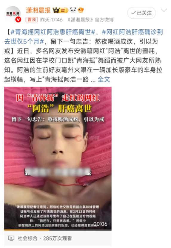 2 月 26 日," 28 年青海舞蹈博主阿浩死于肝癌”的消息引起了人们的关注。 2024 年 9 每月确诊肝癌直至死亡, 5 一个月。死前他留下了一条忠告:熬夜喝酒成疾病,以此为戒!