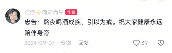 在确诊肝癌之后,阿浩在他的视频评论区留下了一条忠告:“熬夜喝酒成病,以此为戒”。