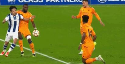 第 6 布莱斯几分钟 - 门德斯挑传,久保健英试图在禁区内控球,吕迪格上身对抗,久保健英倒下,裁判认为是合理的抵抗,没有点球。