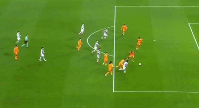皇家社会在主场作战中不断进攻,尤其是右翼的久保健英,频繁制造威胁。开始只是 4 卡马文加在后场犯了一个错误,布莱斯 - 门德斯直传,久保健英插上劲射,卢宁将球扑出。