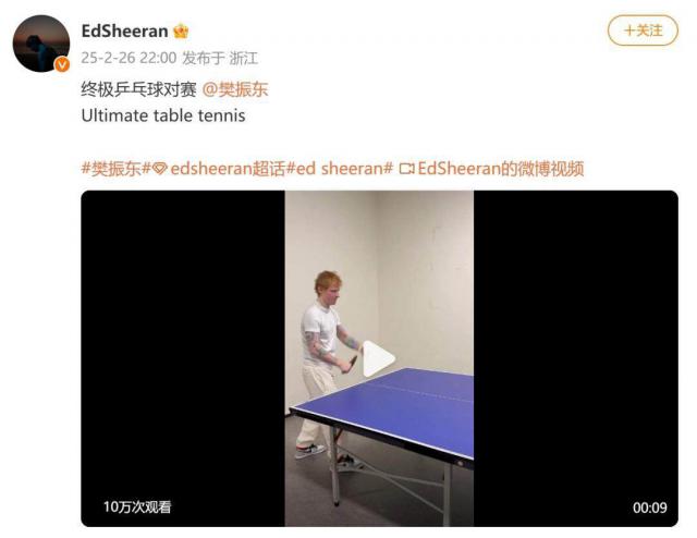 2 月 26 日夜,英国男歌星艾德 · 希兰(Ed Sheeran,昵称“黄老板”)在自己的社交账号上发布了一段与樊振东打乒乓球的视频,并配文为“终极乒乓球比赛”。