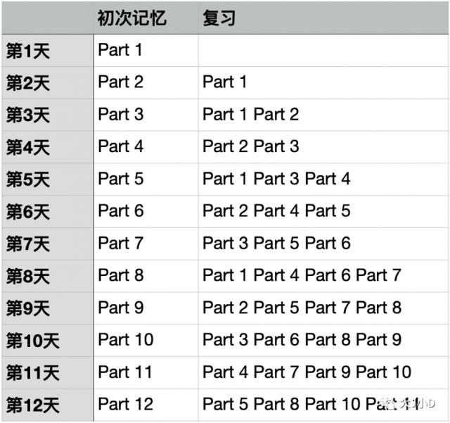 关键是保证第一次记忆的内容可以在第二天和第三天连续复习,然后复习间隔开始延长。第一次是每隔一天复习一次;第二次是每两天复习一次。
