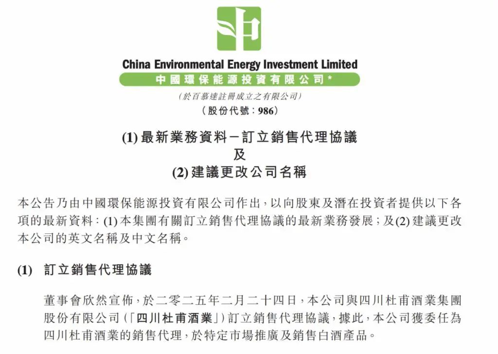 2月24日,中国环保能源投资有限公司(以下简称“中国环保能源”)发布公告,宣布正式与四川杜甫酒业集团有限公司签订销售代理协议。根据协议,中国环保能源将作为杜甫酒业在特定市场的独家销售代理,全面负责其白酒产品的推广和销售,并计划更名为“杜甫酒业集团有限公司”。