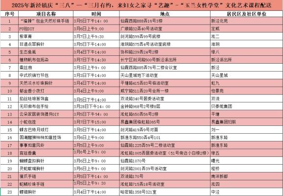 第115个 “三八” 随着国际妇女节的到来,新泾镇妇联精心策划了一场全球沉浸式的节日盛会。3月3日至3月28日期间,各居民区、辖区企业将分发23场主题不同的体验活动。同时,新泾镇还将与上海汇聚迪卡侬店、百联西郊,打造运动时尚双会场,邀请女性朋友赴今年春天的浪漫约会。