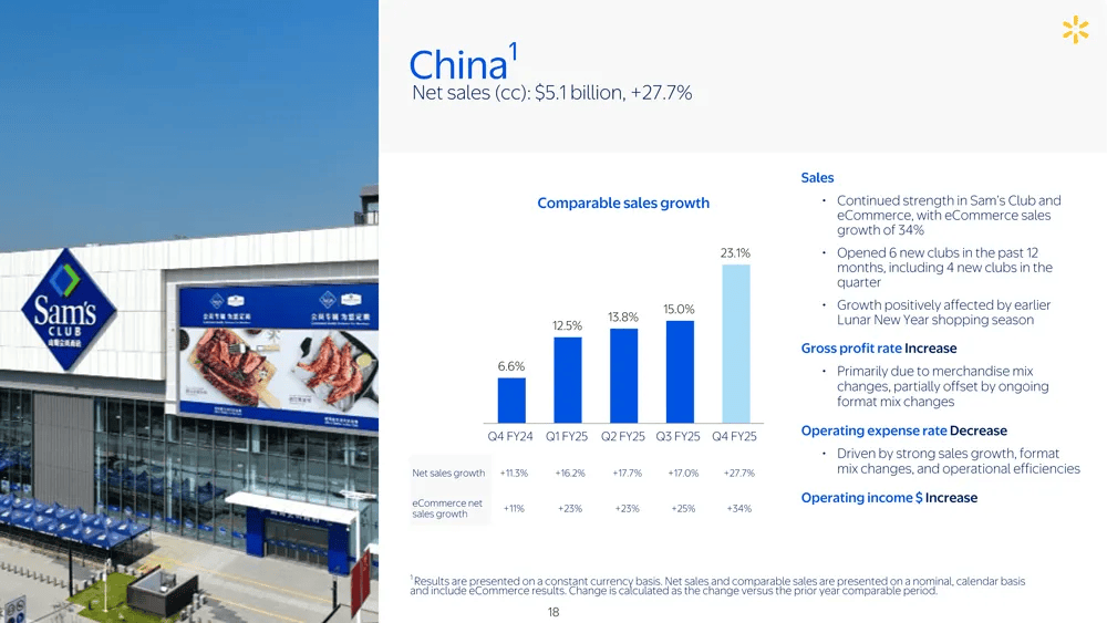 四季度表现特别出色,净销售额达到51亿美元,比上年同期增长27.7%,比上年同期增长23.1%,比上年同期增长16.2%-17.7%,成为沃尔玛全球增长最快的市场。