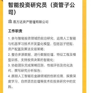 2月25日,易方达基金发布学校招聘信息,其资产管理公司正在招聘智能投资研究员。该职位的主要工作包括:参与智能投资领域的前沿研究,利用人工智能和机器学习技术开发量化模型,包括因素挖掘、财务规划和算法交易策略;整合多源数据,进行数据处理、特色工程和模型培训,支持智能投资决策;跟踪人工智能在金融领域的创新应用。