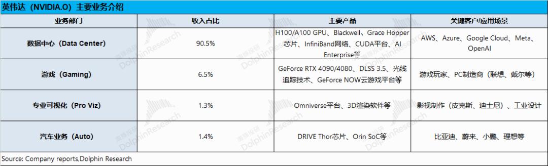 1)数据中心业务:它是目前最重要的焦点,其主要产品包括H100、A100、公司的核心客户是亚马逊、微软、谷歌等云服务大厂,Blackwell等计算率芯片;