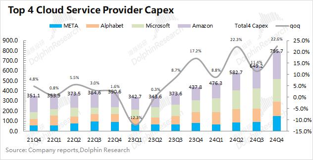 三是大厂资本支出:根据最近的大厂数据,全球核心云服务巨头(meta、谷歌,微软和亚马逊)的总资本支出仍然保持较高的增长。。本季度,2024年第四季度总资本支出达到795.7亿美元,同比增长81.6%,2025年资本支出计划分别有不同程度的增长。