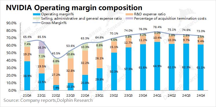英伟达2025财年第四季度营业利润率为61.1%,环比略有下降。。虽然本季度公司费用率略有下降,但毛利率的下降仍然直接影响营业利润率。