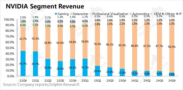 2025财年第四季度,在AI等需求的推动下,英伟达数据中心业务在公司收入中的份额不断扩大,达到90.5%。数据中心业务是影响公司业绩的最重要因素之一,游戏业务的比例被挤压到10%以下。