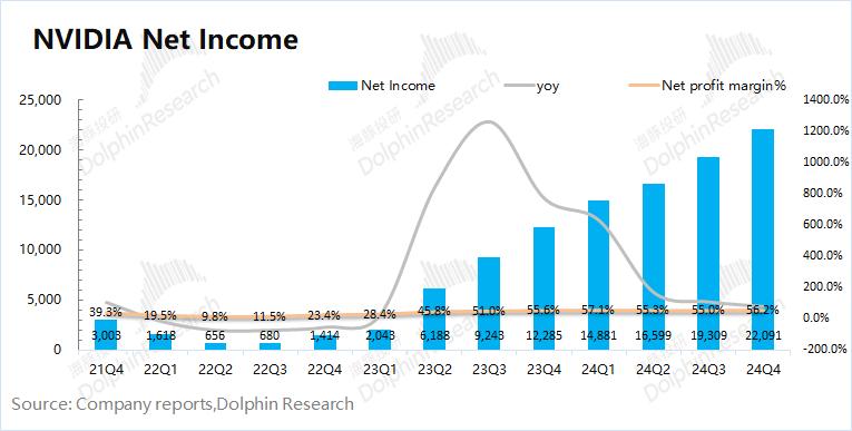 英伟达在2025财年第四季度净利润为221亿美元,比去年同期增长79.8%。本季度净利率为56.2%,有所提高。这一季度,收益方增长较高,继续稀释公司的运营费用。虽然毛利率有所下降,但净利率已经保持在55%以上的较高水平。
