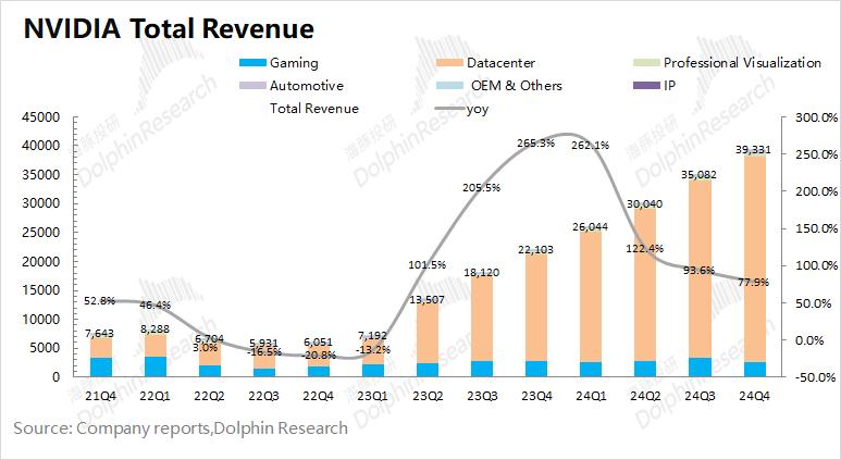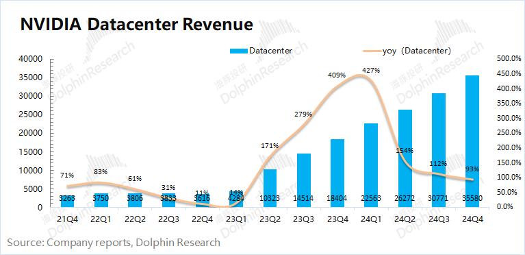 3.1 资料中心业务:英伟达数据中心业务于2025财年第四季度实现营收355.8亿美元,同比增长93.3%。数据中心业务是市场最大的焦点。本季度的增长一般是由Blackwell产品和H200出货增长推动的,主要用于大型语言模型、推荐引擎和生成模式。 AI 实践和推理应用程序。本季度公司数据中心同比增长由计算端情况推动。